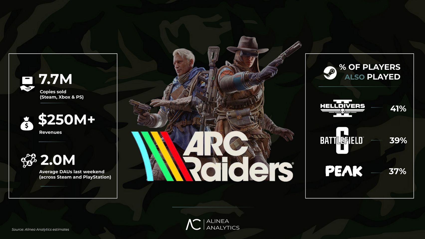 Alinea Analytics, Arc Raiders’ın 16-22 Kasım haftasında yaklaşık 750 bin kopya sattığını söylüyor. Toplam satışlar ise, 7.7 milyona ulaştı ve satışların en az yarısı Steam üzerinden gerçekleşirken, kalan bölümün ise PS5 ve Xbox Series X/S tarafına ait. Kasım ayı Steam listelerinde ARC Raiders’ın arkasında ise bağımsız yapımlar yer aldı.