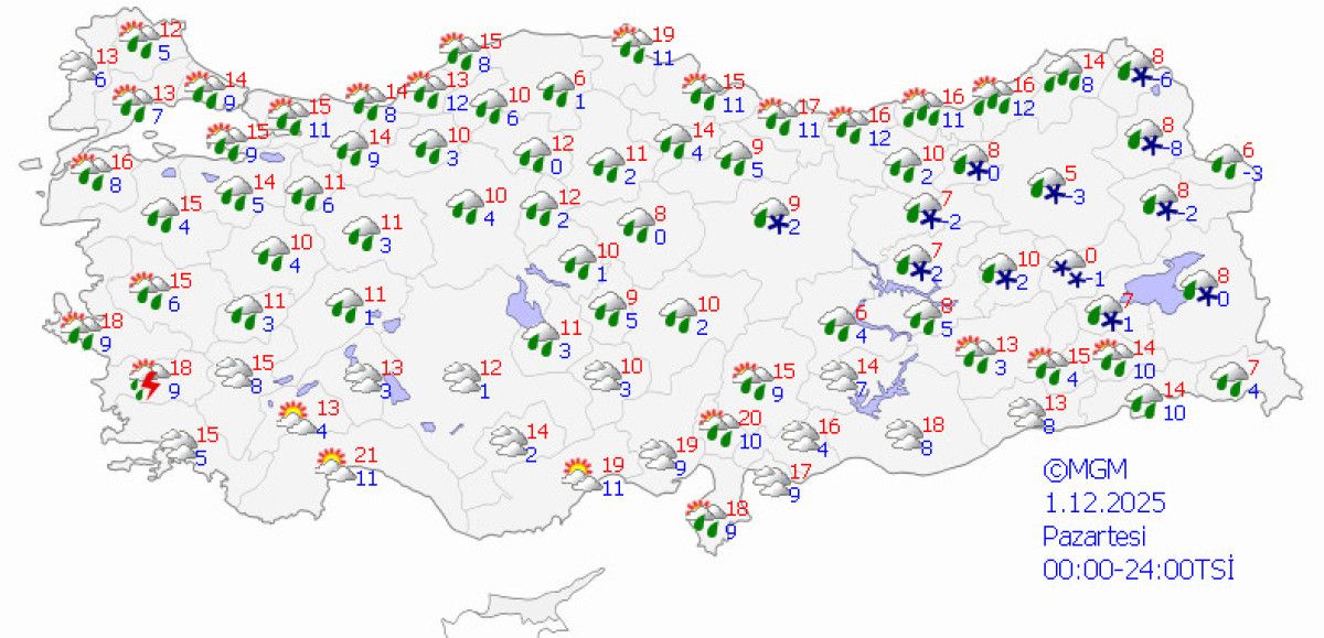 Batı ve Doğu Karadeniz’in iç kesimleri ile Doğu Anadolu’nun kuzeyi ve doğusunda ise karla karışık yağmur ve kara dönüşecek.