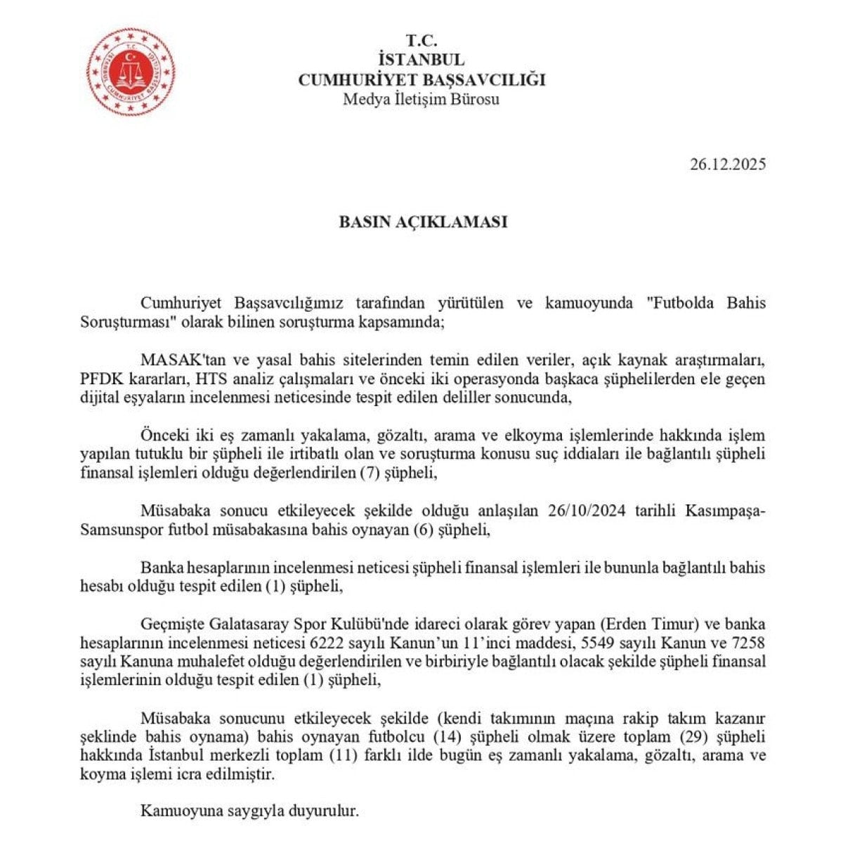 Önceki iki eş zamanlı yakalama, gözaltı, arama ve el koyma işlemlerinde hakkında işlem yapılan tutuklu bir şüpheli ile irtibatlı olan ve soruşturma konusu suç iddiaları ile bağlantılı şüpheli finansal işlemleri olduğu değerlendirilen 7 şüpheli, müsabaka sonucu etkileyecek şekilde olduğu anlaşılan 26/10/2024 tarihli Kasımpaşa-Samsunspor futbol müsabakasına bahis oynayan 6 şüpheli, banka hesaplarının incelenmesi neticesi şüpheli finansal işlemleri ile bununla bağlantılı bahis hesabı olduğu tespit edilen TFF’de görevli 1 şüpheli, geçmişte Galatasaray Spor Kulübü’nde idareci olarak görev yapan Erden Timur ve banka hesaplarının incelenmesi neticesi 6222 sayılı Kanun’un 11’inci maddesi, 5549 sayılı Kanun ve 7258 sayılı Kanuna muhalefet olduğu değerlendirilen ve birbiriyle bağlantılı olacak şekilde şüpheli finansal işlemlerinin olduğu tespit edilen 1 şüpheli, müsabaka sonucunu etkileyecek şekilde (kendi takımının maçına rakip takım kazanır şeklinde bahis oynama) bahis oynayan futbolcu (14) şüpheli olmak üzere toplam (29) şüpheli hakkında İstanbul merkezli toplam 11 farklı ilde bugün eş zamanlı yakalama, gözaltı, arama ve koyma işlemi icra edilmiştir. Kamuoyunun bilgisine sunulur.”