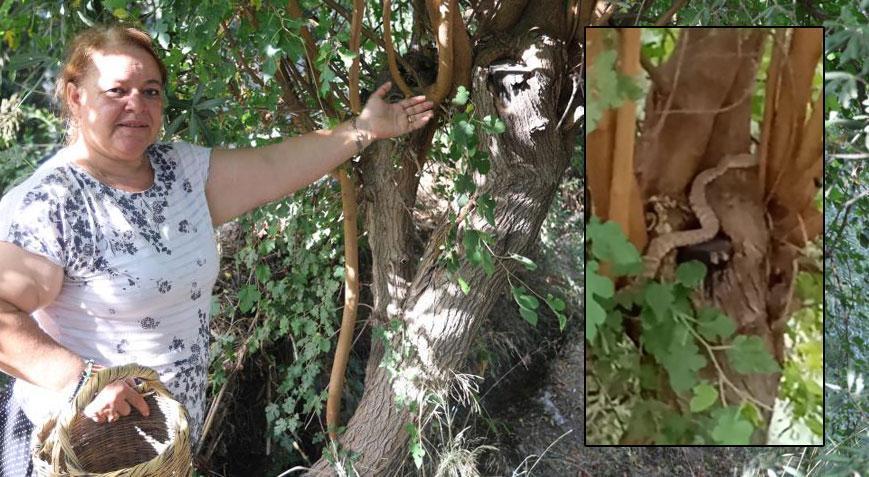 Hatay’ın Antakya ilçesinde çiftçilik yapan Süheyla Özkurt, incir toplarken dut ağacı üzerinde 1 buçuk metrelik engerek yılanıyla karşılaştı.