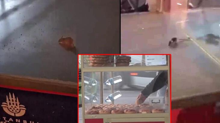 TÜYAP Otobüs durağının arkasında bulunan ve günlük simit poğaça satışının yapıldığı tezgahta dolaşan fareyi görenler şok oldu. Aynı simit tezgahına bu sabahta poğaça ve simitlerin dizildiği görüldü.
