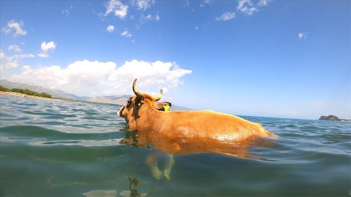 Sıcaktan bunalan hayvanların imdadına Van Gölü yetişiyor