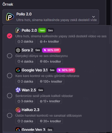 Pollo AI, kendi yapay zeka modelinin yanı sıra Google Veo 3.1, OpenAI Sora 2 gibi popüler metinden videoya dönüştürme modellerini de barındırıyor.