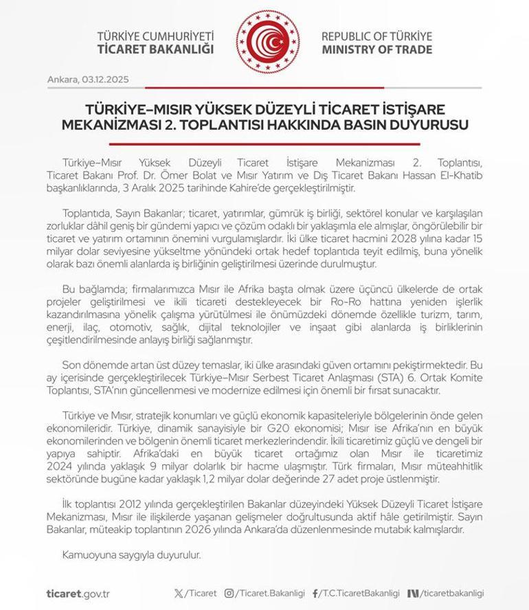 “İkili ticaretimiz güçlü ve dengeli bir yapıya sahiptir. Afrika’daki en büyük ticaret ortağımız olan Mısır ile ticaretimiz 2024’te yaklaşık 9 milyar dolarlık bir hacme ulaşmıştır. Türk firmaları, Mısır müteahhitlik sektöründe bugüne kadar yaklaşık 1,2 milyar dolar değerinde 27 proje üstlenmiştir. İlk toplantısı 2012’de gerçekleştirilen Bakanlar düzeyindeki Yüksek Düzeyli Ticaret İstişare Mekanizması, Mısır ile ilişkilerde yaşanan gelişmeler doğrultusunda aktif hale getirilmiştir. Bakanlar, müteakip toplantının 2026’da Ankara’da düzenlenmesi konusunda mutabık kalmışlardır.”